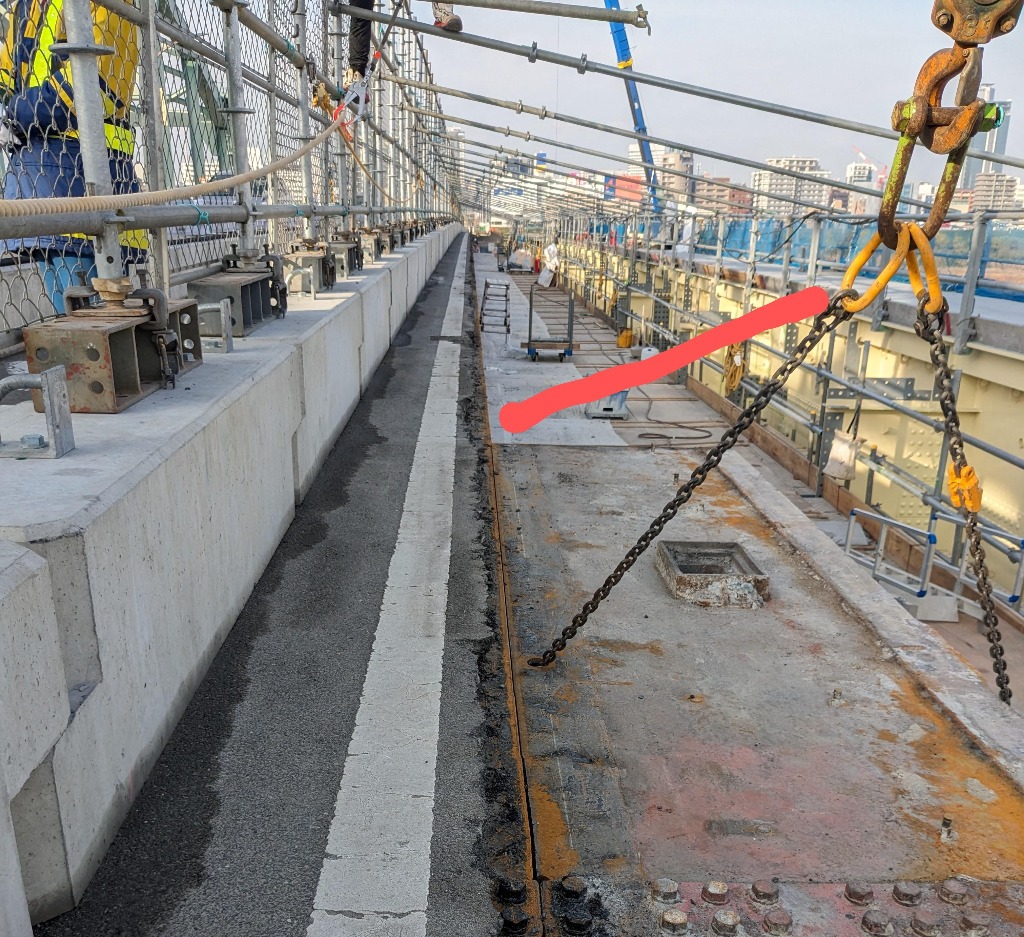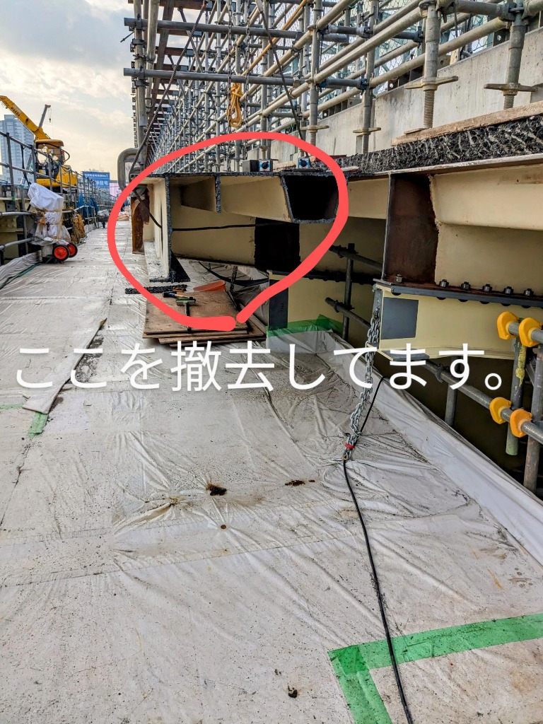 赤い部分を撤去してます。ガス溶断で切ってクレーン撤去していきます。